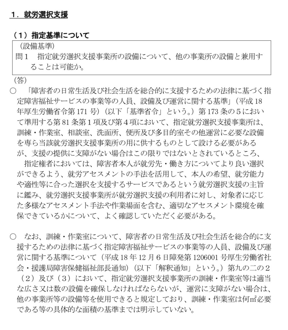 可能とする・しないは指定基準上ダメとしていないが、諸々勘案して判断されるケースがある書き方。訓練・作業室の面積要件も明示はしていない。