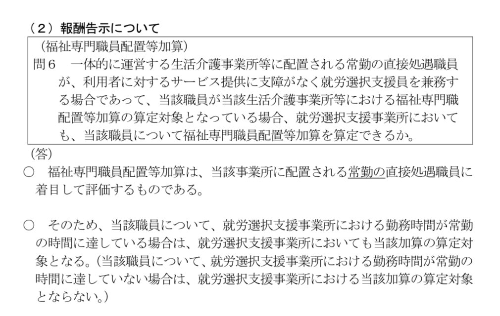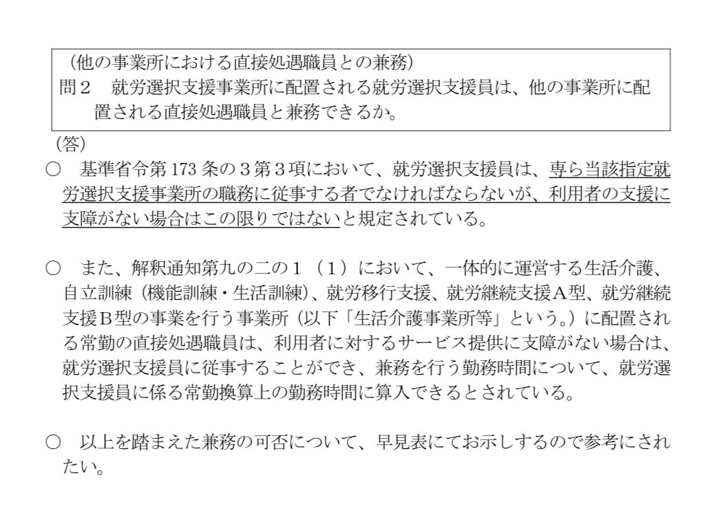 こうした行政文書は解釈の余地が残されている場合が多く、指定権者によって対応が分かれることがあります。そのため、事業所としての運営方針を整理した上で相談することが重要です。