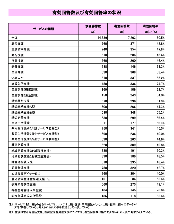 全ての事業所からヒアリングできているわけではなく、一部の優良事業所の声が多く反映されている可能性もあります(例えば、放課後等デイサービスは22,000以上ありますが、今回の回答は304(全体の1.3%ほどから集計していることになります)。