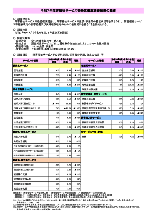 障害福祉サービス等経営概況調査は、障害福祉サービス等施設・事業所の経営状況等を明らかにし、障害福祉サービス等報酬改定の影響把握及び次期報酬改定のための基礎資料を得ることを目的としたものになります。