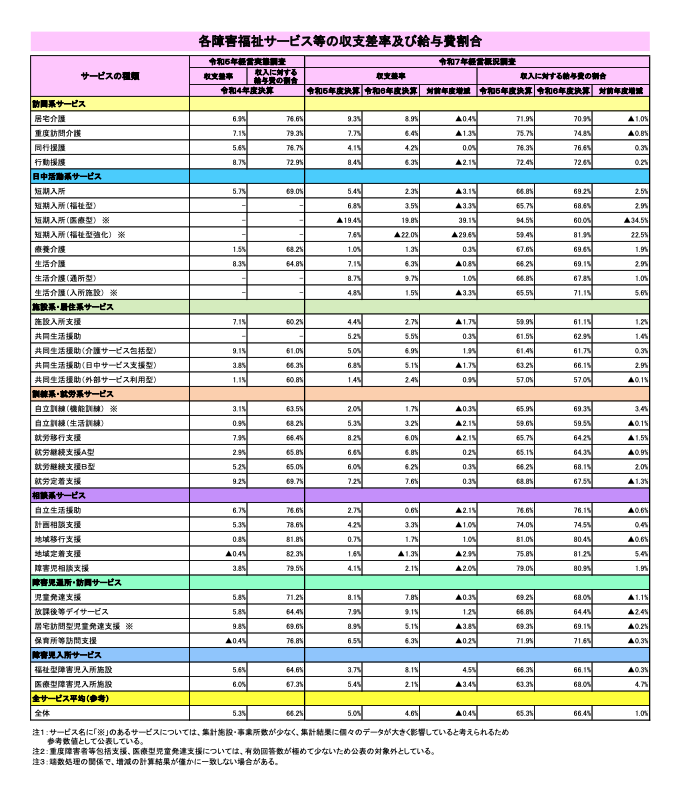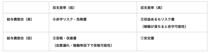 事業所が赤字側に分類される目安としては、給与費割合が65%を超えている・収支差率8〜9%を切っている場合に陥りやすくなる数字であることが考えられます。
